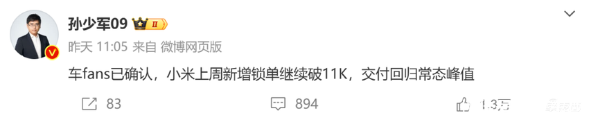 此外,小米集团公关部总经理王化本周一在社交媒体上发文表示:“瞄了一眼后台上周的数据,交付、锁单、生产……又有人要破防了…… ”。
